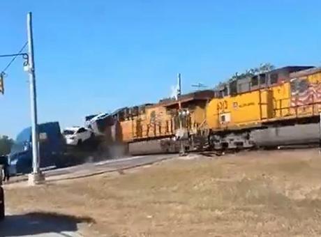 ABD’nin Texas eyaletine bağlı Schertz şehrinde araç taşıyan tır, hemzemin geçitte mahsur kaldı.
