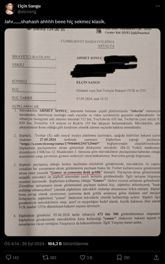 Oyuncu Elçin Sangu sosyal medya hesabından yaptığı paylaşımda, Jahrein lakaplı Sonuç’un kendisinden şikayetçi olduğu dilekçenin fotoğrafı paylaşarak, “Jahr…….shahash ahhhh beee hiç sekmez klasik” yorumunda bulundu.